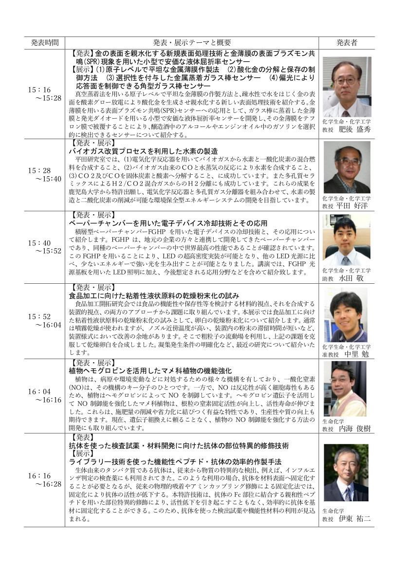 鹿児島大学理工学研究科の研究シーズ・知財に、企業人が直接接して詳しく知ってもらうことにより、産学の交流を促進することを目的とするもので、講演会、研究シーズ・知財発表会、パネル展示によるマッチング相談会、また、特別企画として、普段は見学できない理工系の研究室を見学できる「理工系ラボツアー」も開催されます。